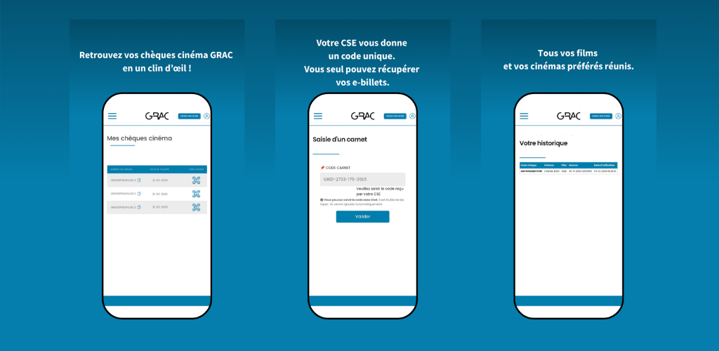 Ces données sont utilisées uniquement pour fournir le service d’accès aux chèques cinéma GRAC. Elles ne sont ni vendues ni partagées avec des tiers.